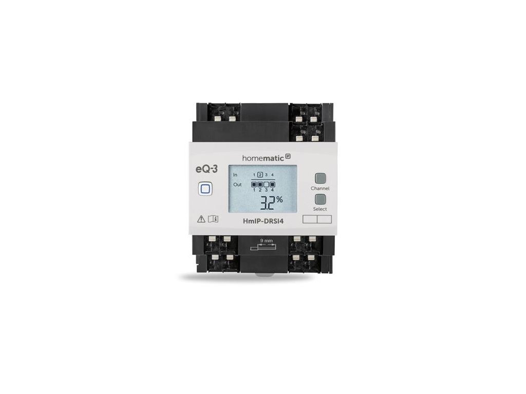 Programovatelný bezdrátový čtyřkanálový Spínací akční člen s LCD (HmIP-DRSI4) pro montáž na DIN lištu, napájený ze sítě 230 V a certifikovaný organizací VDE, je součástí systému chytré domácnosti Homematic IP.
